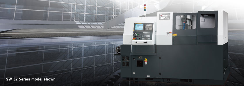 SW 系列以二个工程可于 1 台机台内同时完成为设计概念,正、副主轴搭配正、背面刀具系统可具备 C 轴及动力刀具切削能力,并允许各系统同时间个别切削两工件,展现极高工作效率