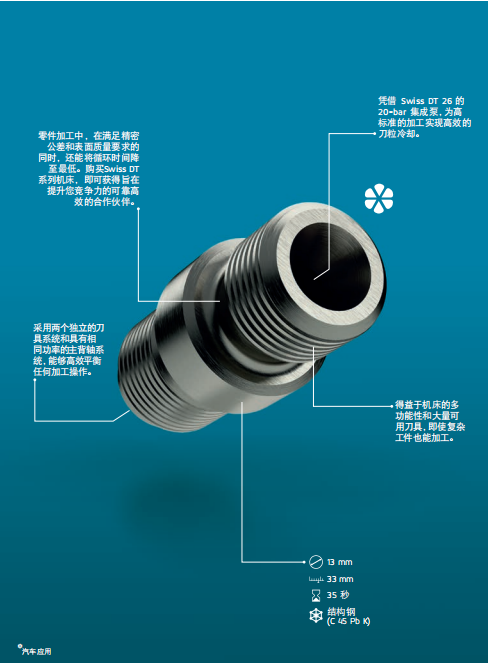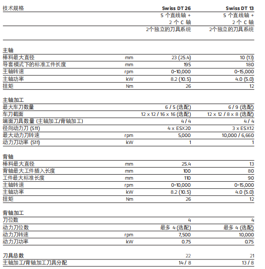 Swiss DT 系列瑞士型车床专业设计满足典型长 短车削工件的各种要求。该系列机床简单易 用,加工直径达 13 和 25.4 mm,可显著提高生 产效率。Swiss DT 系列采用先进的技术和高效的五轴运动结构,是所有车削和铣削加工的理想之选。